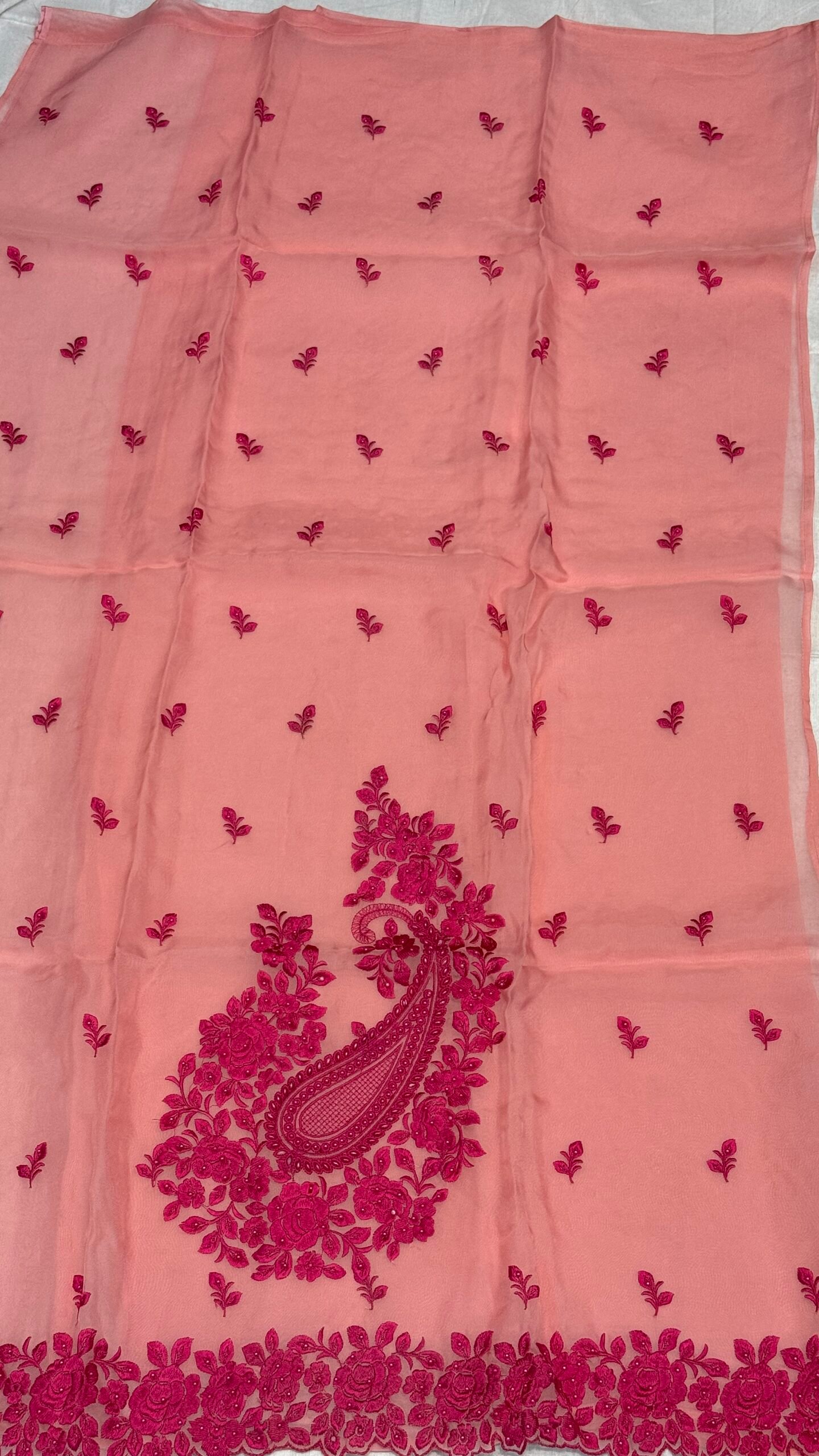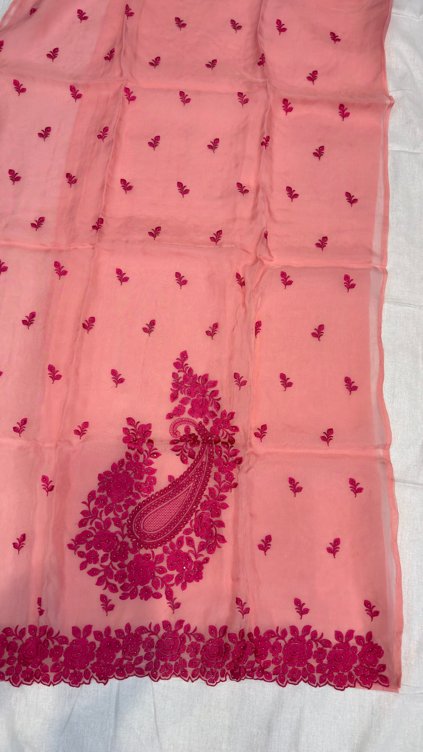 Apne ethnic wardrobe mein char-chaand lagaiye hamare is exclusive Fancy Organza Suit ke saath. Soft Peach base par Vibrant Pink dhage ki embroidery isse ek dam fresh aur trendy look deti hai. Ye suit khaas un ladies ke liye hai jo comfort ke saath-saath heavy party-wear look dhoond rahi hain.